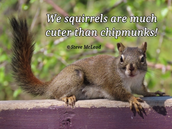 Mica, the Red Squirrel is out here right now, in the walnut tree, chattering away. He is upset with something, though I have no idea what it is. Good, he has stopped now. They can be quite noisy at times. Could have been the neighbors cat he was scolding.