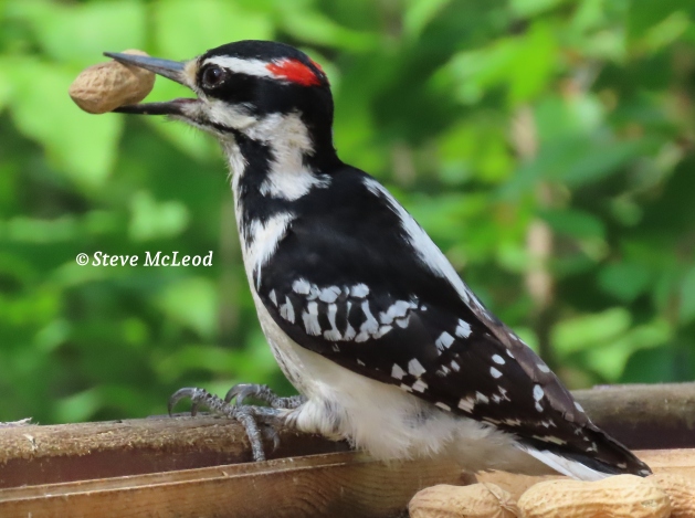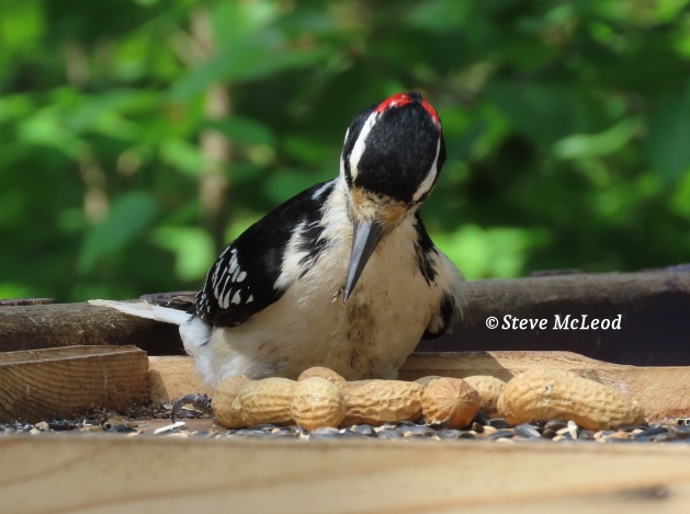 Herman, the Hairy Woodpecker, on the feeder trying to choose which peanut to take.