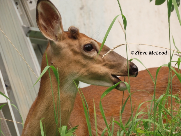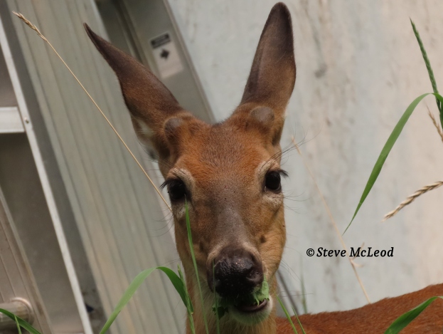 Junior munching on some grass. You can see the little knobs on his head, the beginnings of his new antlers.
