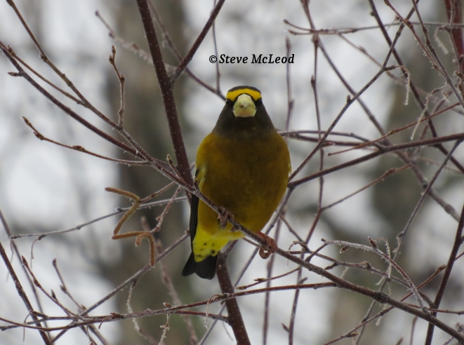 A male Evening Grosbeak watching me.