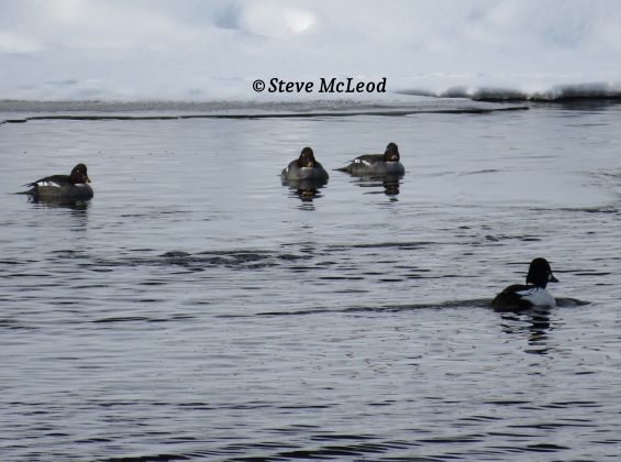 Goldeneye ducks swimming on the river on a January afternoon with a temp of -20F (-28C).