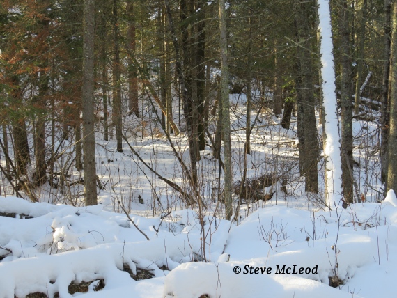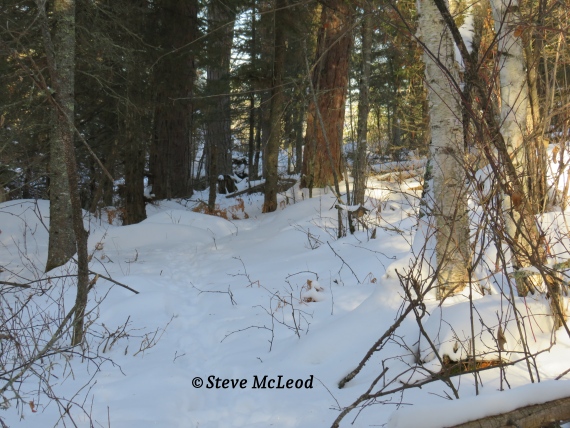 The sun was shining through the pines and it looked so beautiful. The snow was not so deep either, about 3 feet. It was so amazingly quiet, there was no wind, not a sound of anything could be heard. Except me breathing in that cold air. It was -20F (-29C), so not too bad for a January day. There were a lot of deer tracks in the snow, but nothing too recent.