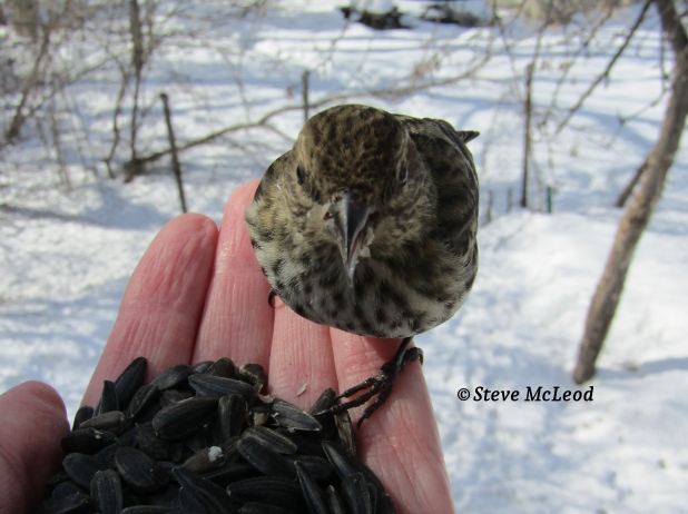Pine Siskin on my hand, 2 winters ago.