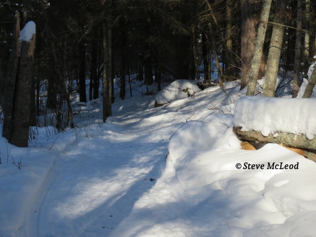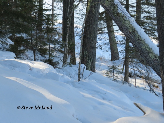 I noticed a deer had walked across the pond recently, so I decided to follow in it’s tracks and I was soon on the other side. I walked up onto a hill on that side of the pond and decided to stop for some coffee and a sandwich. The smell of coffee brought some Canada Jays looking for food. It probably was not the coffee that attracted them, but it sounds good for the story.