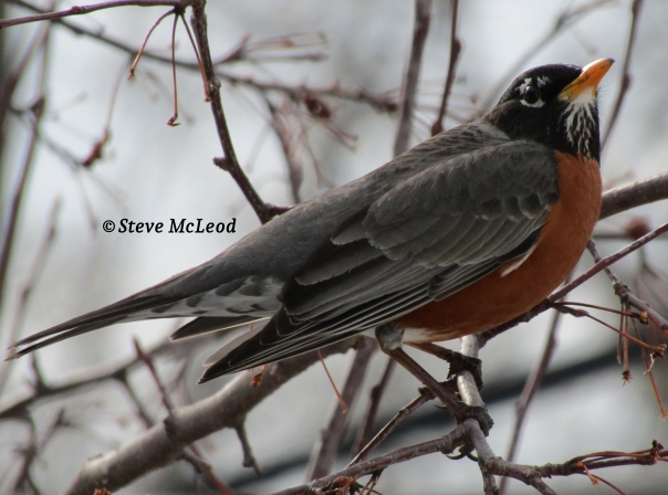 It is quite amazing to see them out there with their webbed feet on that cold ice, and it does not bother them at all. Just like standing on nice grass for them. I do not think I would like to try it though. Bad idea completely. On Sunday I also saw my first American Robin. I love to see them back again and there was one around our building yesterday too that was singing so nicely.
