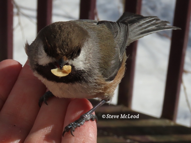 Then there are the small birds, like this Boreal Chickadee, that are brave enough to land on my hand for food. They are easiest to see in late fall through to early spring. They hide away in the thicker areas of the forest for their nesting season.