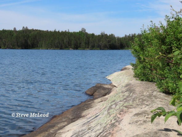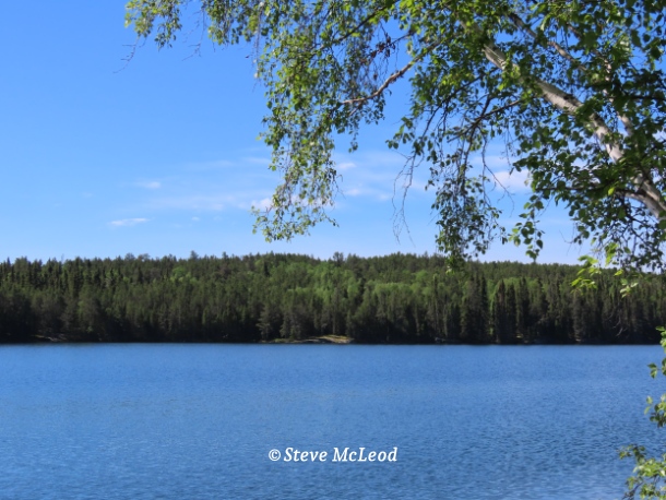 It really is a beautiful, small lake, a great place for a canoe since even on a windy day there are no big waves to worry about. There are many different varieties of trees in this small area, mostly Jack Pine, but some White Spruce, Aspen, Birch, Balsam and shrubs like Pincherry and Saskatoon. So, it is a wonderful spot to sit and relax for a while.