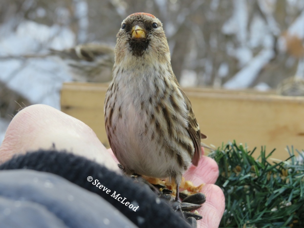 Female Common Redpoll on my hand.