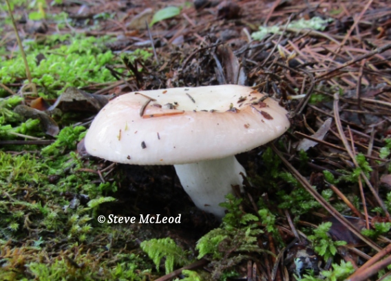 The one today has a milky substance that stains a brownish color. It is a nearly white mushroom but can have splotches of brownish stain on the cap, especially toward the center. These mushrooms grow under conifer trees and the cap can be a bit sticky as it emerges, so it ends up being somewhat dirty, or discolored, or covered with pine needles.