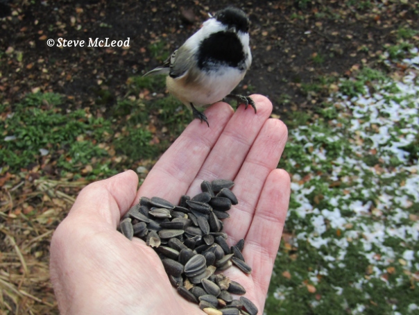 During the winter they basically eat constantly through the day because if they don’t get enough food, they will not survive the long cold night. They are very friendly little birds and will readily land on a person’s hand to get food. I have had several on me at one time, sitting on my hand, arms, shoulders and head!