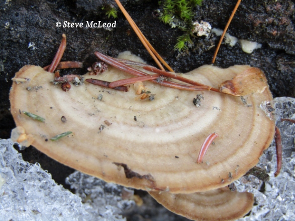 Oh well, anyway, we are here to talk about mushrooms again, not weather. Today’s mushroom is the Thin-Maze Flat Polypore. This mushroom is also called Blushing Bracket since the underside pore surface will bruise pink to reddish when it is young. It can be found mainly on Birch and Willow and is quite flat with concentric bands on the surface.