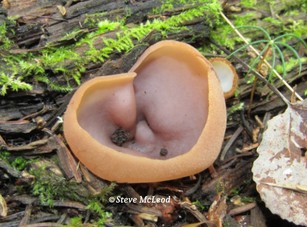 The cup fungus is the Spreading Cup and the one in my photo is a fairly young specimen. Mature specimens are flatter and darker in color. They are found growing on wood, mine is on a very rotten log. This cup fungus is also INEDIBLE. The cup fungus is found from late spring through summer.