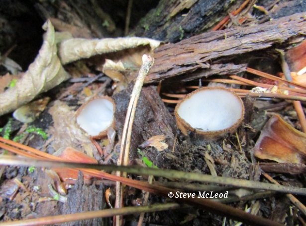 Spreading Cup Fungus with small Bird’s Nest Fungus on the upper right of it.