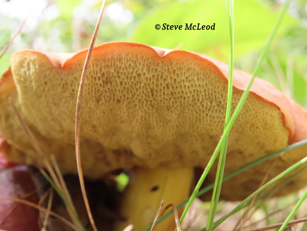 We discovered a number of interesting things that day, including this mushroom, called the Yellow-Cracked Bolete. These mushrooms can have a cap up to 8 inches (20cm) across. However, the mushrooms I found were mostly 3 to 4 inches (7.5 to 10cm) across, with one that was 5 inches (12.5cm) across. All had stems that were 3 to 4 inches (7.5 to 10cm) long.